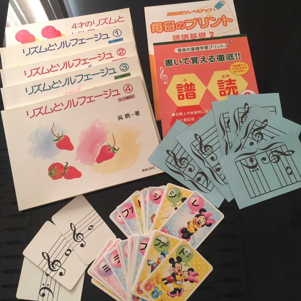 メロディー視唱教本、リズム教本、音楽ドリル、音符カード、リズムカード、五線紙ボード、五線紙ノート、ミニ楽器などを使って、生徒さんの年齢や進度に合わせて必要な知識を、楽しみながら着実に身につけていきます。